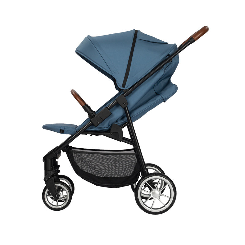 Materials: Black baked enamel iron pipes, foam-padded handles and fabric front armrests, 300D regular anionic fabric, 5-point safety buckle, four-section single-layer canopy with the third section as a zippered hidden layer, mechanically adjustable backrest, 7&9.5-inch EVA wheels.